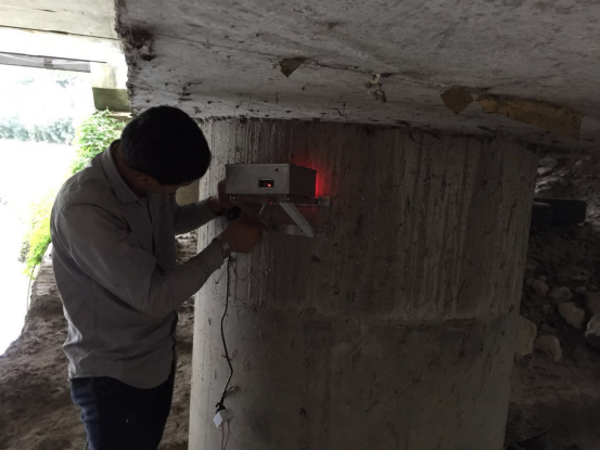 线施工中二十埠桥路段桥墩沉降监测部分在线位移监测仪的安装工作。